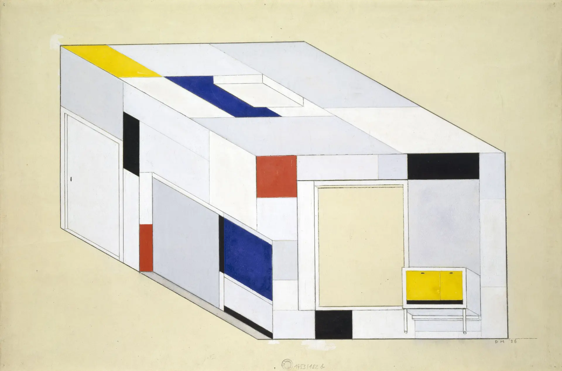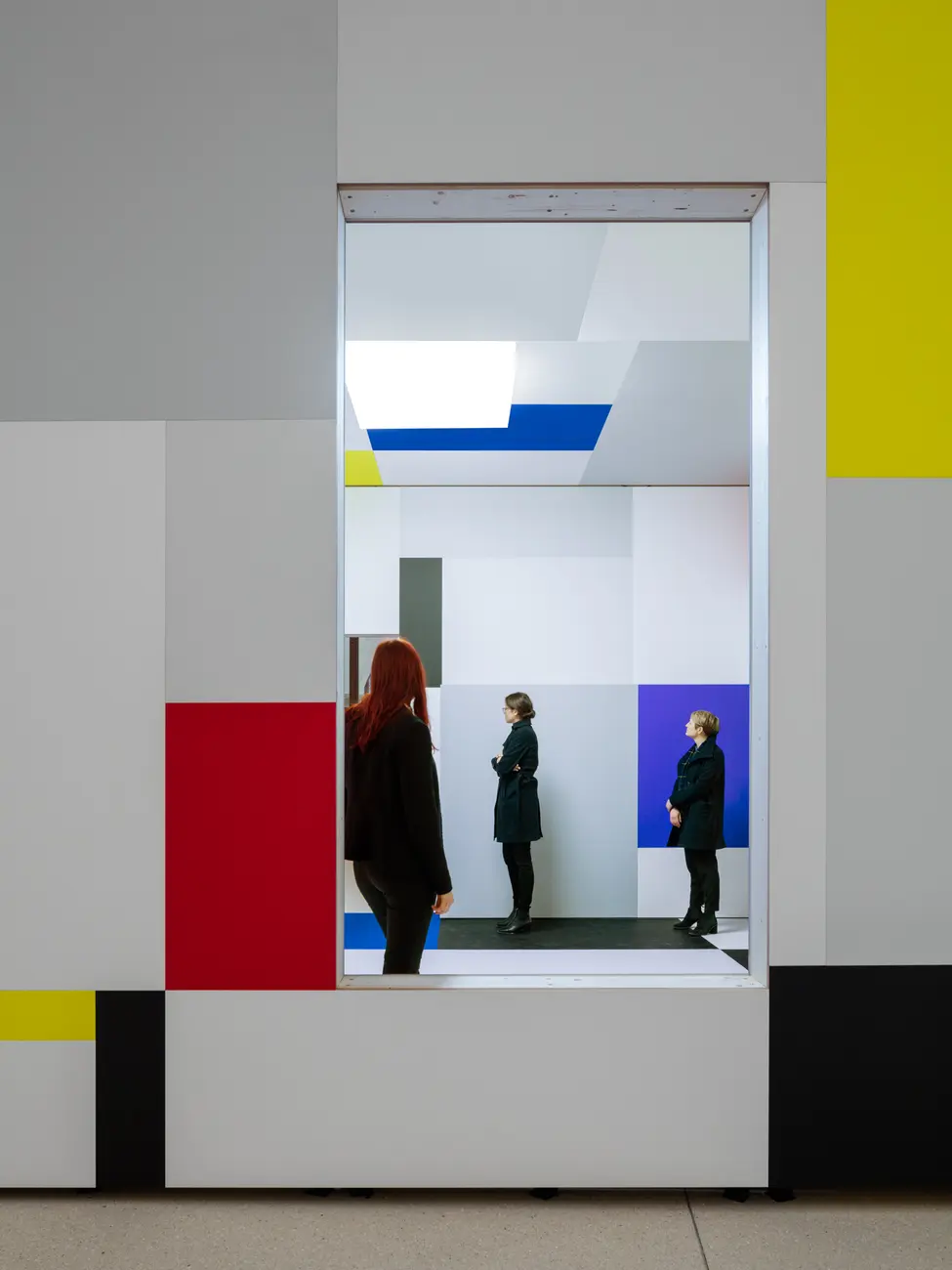 In the Albertinum he is presenting a selection of recent paintings from this series as well as a new spatial installation in the atrium. The basis for this work consists of design drawings produced by Piet Mondrian in 1926 for a room in the home of the Dresden art collector Ida Bienert, which are on view in the exhibition entitled “Visionary Spaces” in the Albertinum. Whereas Mondrian’s design was never actually implemented, Zobernig’s installation in the original dimensions of that room can be entered and experienced as a cubic sculpture.